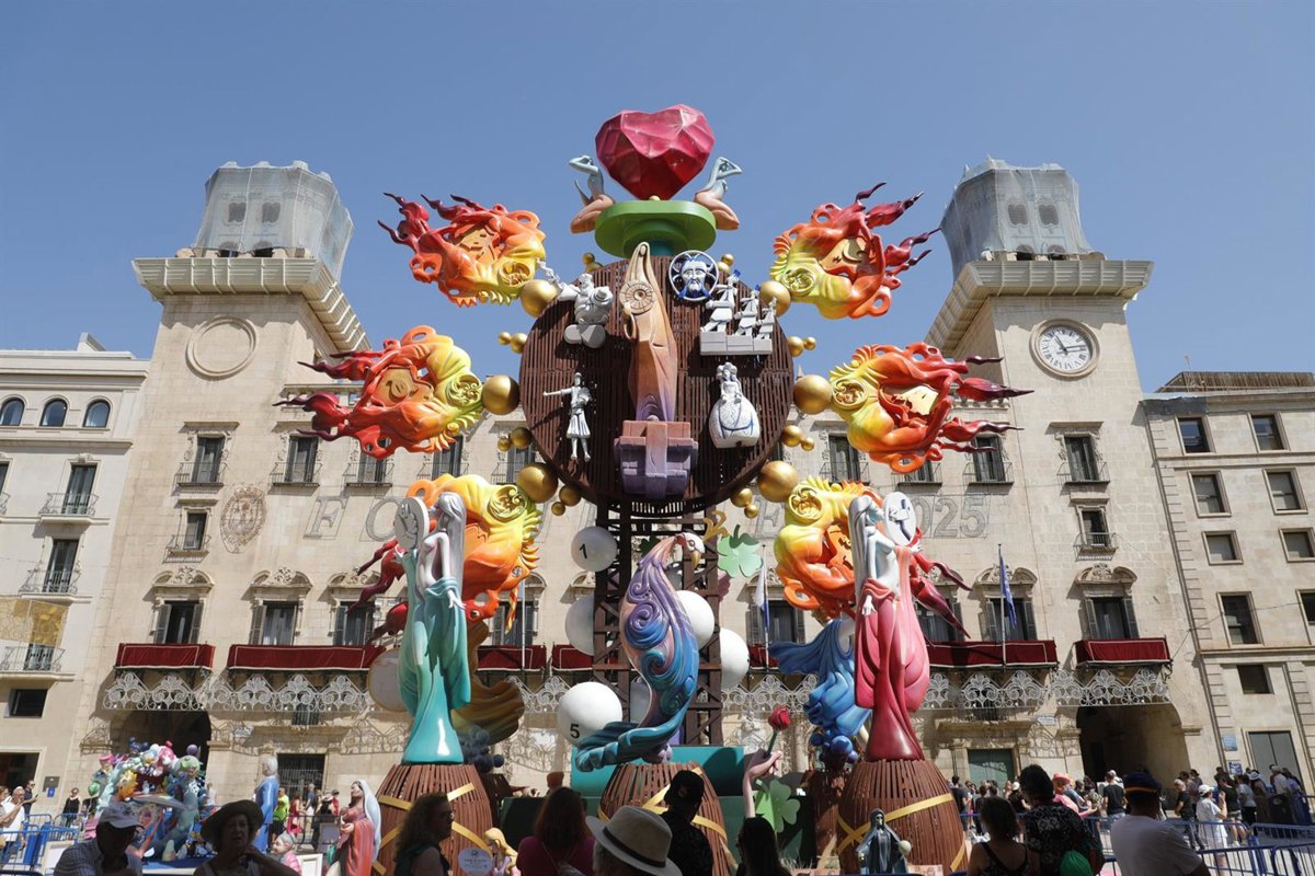 Imagen de la hoguera oficial de 2025, ubicada en la plaza del Ayuntamiento de Alicante - Joaquín P.Reina - Europa Press