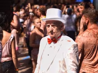Un hombre vestido con un traje y un sombrero blanco, pasea por una calle de Buñol, durante la fiesta de la Tomatina de Buñol 2019. - Jorge Gil - Europa Press - Archivo