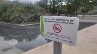 Cartel de prohibición del baño en una fuente ornamental del Parc Central - EUROPA PRESS