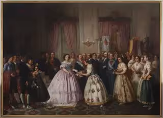 Esta obra representa el besamanos de la reina Isabel II en el Palau de Cervelló en 1858 con ocasión de la visita que la monarca realizó a la ciudad de València.
