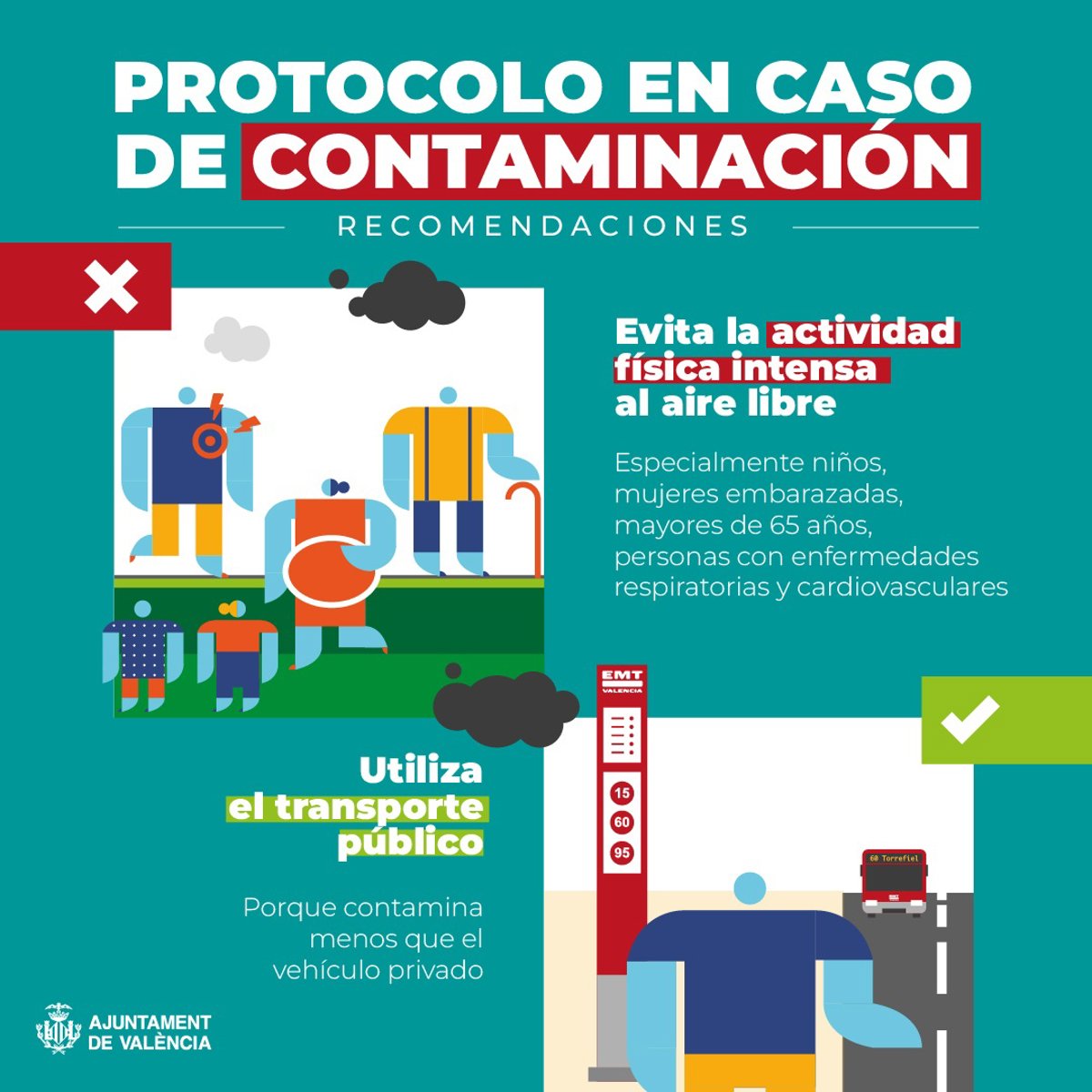 Ante esta situación, el Ayuntamiento de València ha activado el protocolo de medidas informativas en episodio tipo 1, en el que ha recomendado evitar la actividad física al aire libre, especialmente niños, mujeres embarazadas, personas mayores de 65 años y con enfermedades respiratorias y cardiovasculares.