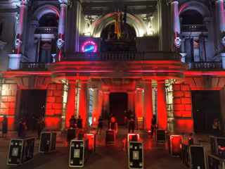 En la capital valenciana, la plaza del Ayuntamiento se ha llenado de equipamiento de sonido vacío, que se ha situado a modo de lápidas en la fachada frontal del consistorio.