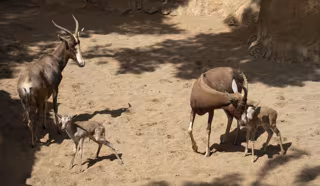 Los blesboks están en uno de los recintos multiespecie más admirados del parque, el que recrea la sabana, donde conviven con jirafas, aves como los jabirús, el ibis sagrado y la cerceta del Cabo y otras tres especies de antílopes, kobos, impalas y gacelas de Thomson.