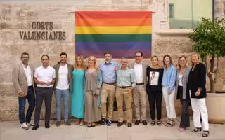 Diputados del GPP, acompañados entre otros de la secretaria autonómica de Igualdad y Diversidad, Asunción Quinzá; y el director general de Diversidad, Stephane Soriano, han asistido en la fachada principal de Les Corts a la colocación de la bandera arcoíris en apoyo al colectivo LGTBI con motivo del Día del Orgullo.