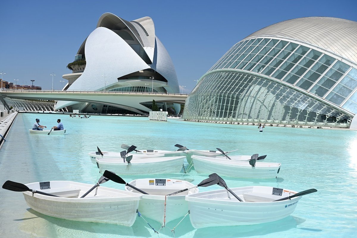 La Ciutat de les Arts i les Cincies de Valncia ha puesto en marcha de nuevo las actividades exteriores en el lago del Hemisfric. Se trata de una pequeña flota de kayaks y barquitas para que el público 'explore' de forma diferente uno de los espacios más característicos del complejo.