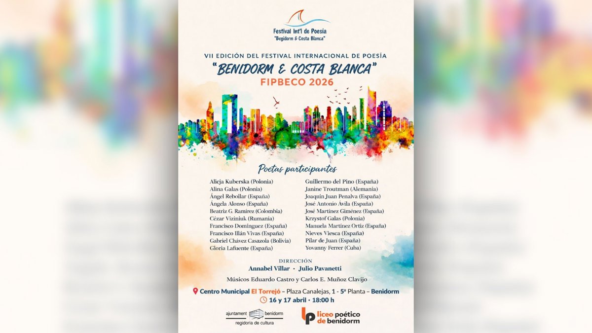 El centro municipal El Torrejó de Benidorm acogerá este jueves y viernes, en la quinta planta del edificio, la celebración del VII Festival Internacional de Poesía 'Benidorm y Costa Blanca' (Fipbeco 2026), que dará comienzo a las 18 horas cada una de las dos jornadas y que contará con una veintena de poetas participantes.