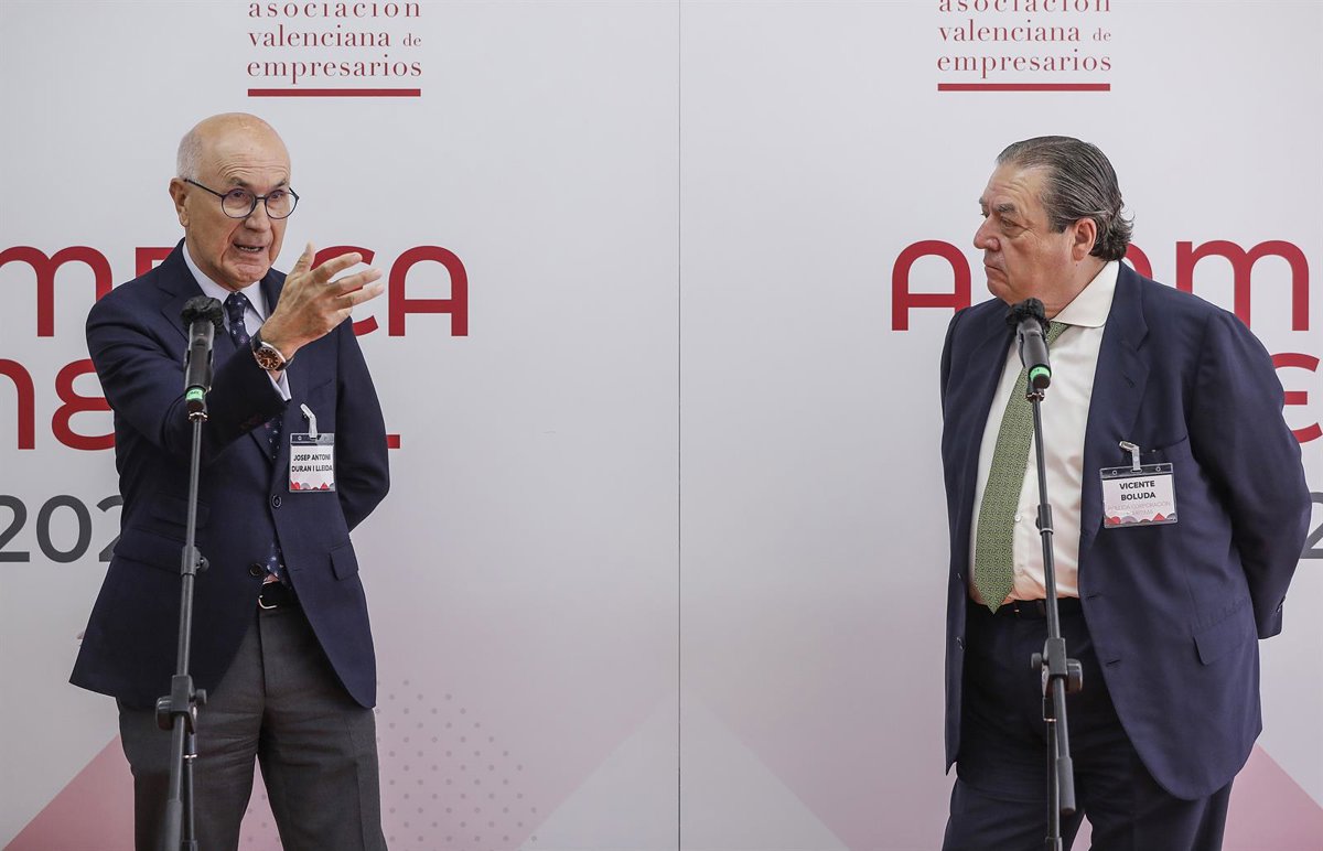 El exportavoz de CiU en el Congreso y exlíder de Unió Democrtica, Josep Antoni Duran i Lleida (i) y el presidente de AVE, Vicente Boluda (d), intervienen en la Asamblea General de la Asociación Valenciana de Empresarios (AVE) 2021. - Rober Solsona - Europa Press