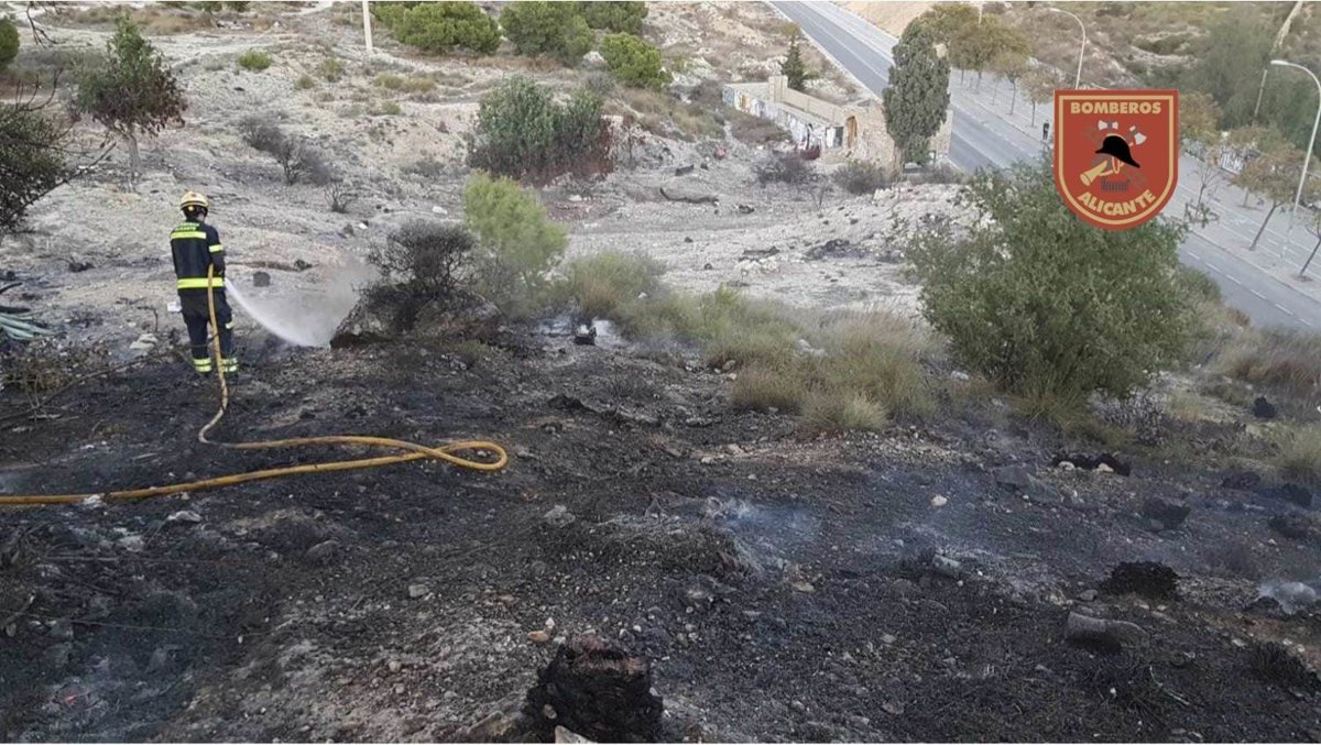 Dos dotaciones de Prevención, Extinción de Incendios y Salvamento del Ayuntamiento de Alicante (SPEIS) han extinguido este lunes un incendio en una zona montañosa situada de la avenida de Jaime I que ha afectado a una superficie de 300 metros de monte bajo y matorrales.