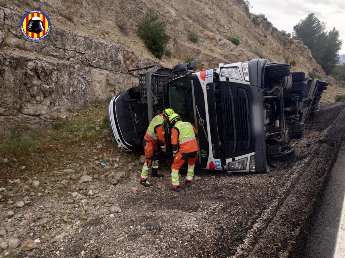 Efectivos del Consorcio de Bomberos de Valencia han intervenido este sábado en un accidente en la A-35, a la altura del corredor de Almansa (Albacete), en el que un vehículo de transporte de coches se ha salido de la vía y ha volcado.