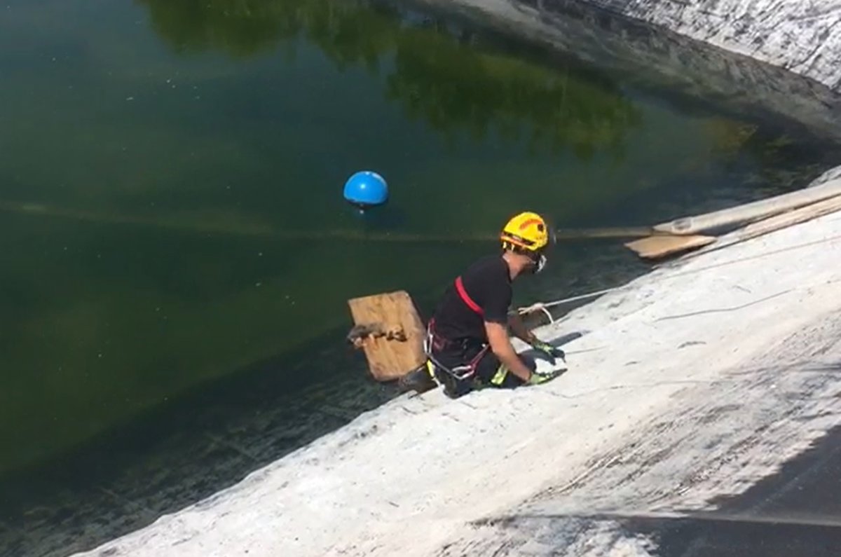 Un bombero ha descendido por la pared del embalse, colgando con la ayuda de un arnés, hasta poder alcanzar al perro y, finalmente, lo ha subido en brazos.