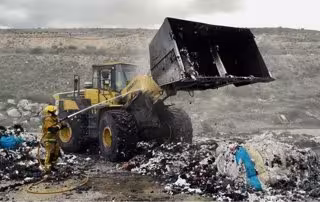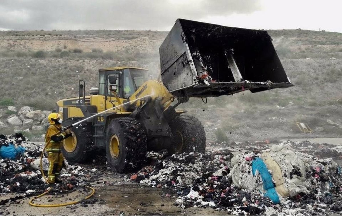 Efectivos del Consorcio Provincial de Bomberos de Alicante trabajan en la extinción de un incendio que afecta a la planta de Reciclajes del Mediterráneo, ubicada en la carretera de Villena a Caudete (Albacete) en el paraje de Los Cabecicos.