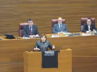 Bonig, durante la sesión de control al 'president' del pleno de las Corts, donde ha preguntado a Ximo Puig sobre la política económica, ha subido a la tribuna de oradores del hemiciclo con una camiseta en la mano en la que se lee 'Transparencia. Volem els papers', que ha colgado en la tribuna durante su intervención.