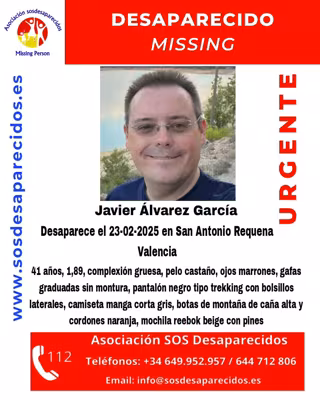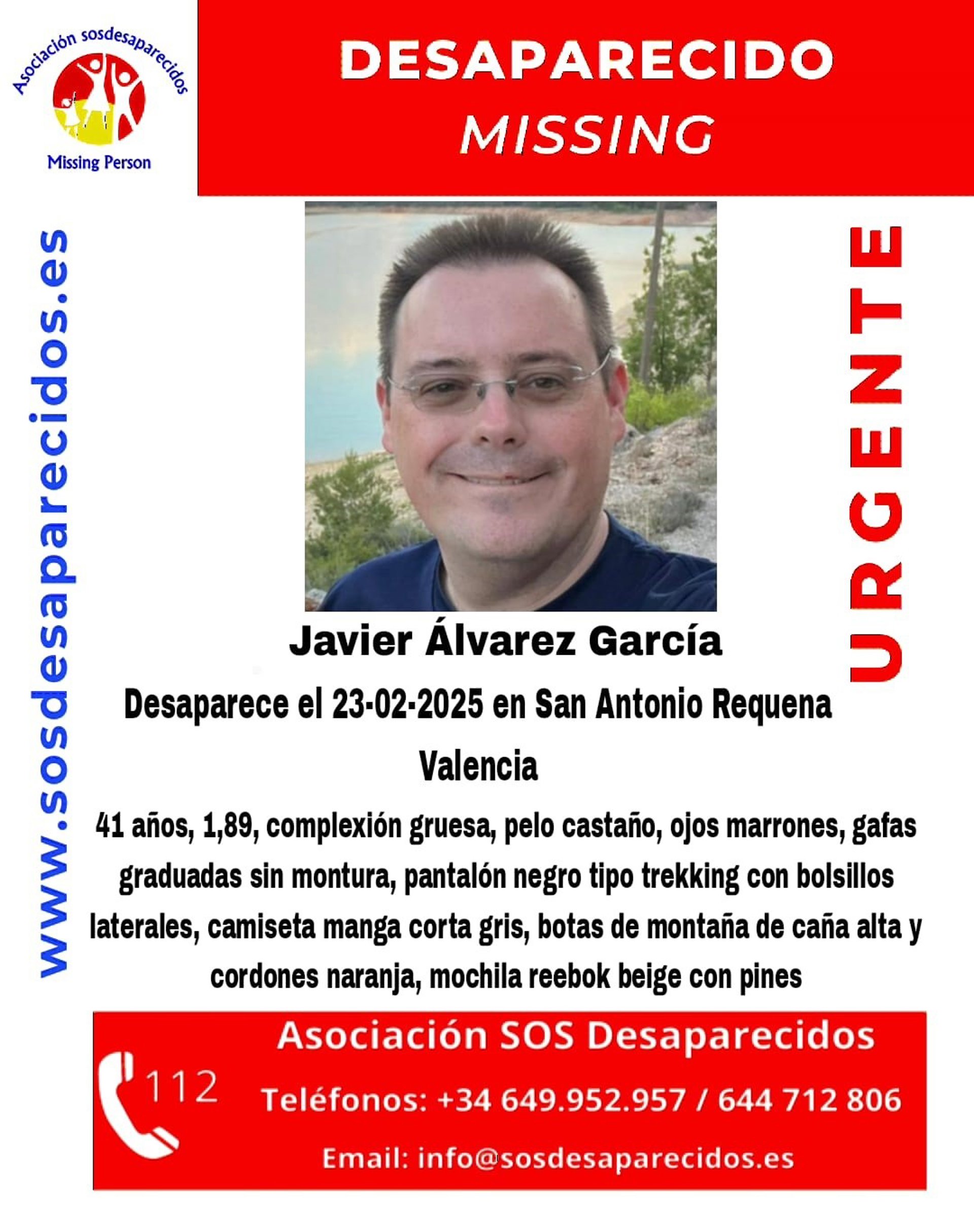 Familiares, amigos y Fuerzas y Cuerpos de Seguridad buscan a Javier Álvarez García, un hombre de 41 años desaparecido desde este domingo en la localidad valenciana de Requena, según ha alertado la asociación SOS Desaparecidos.