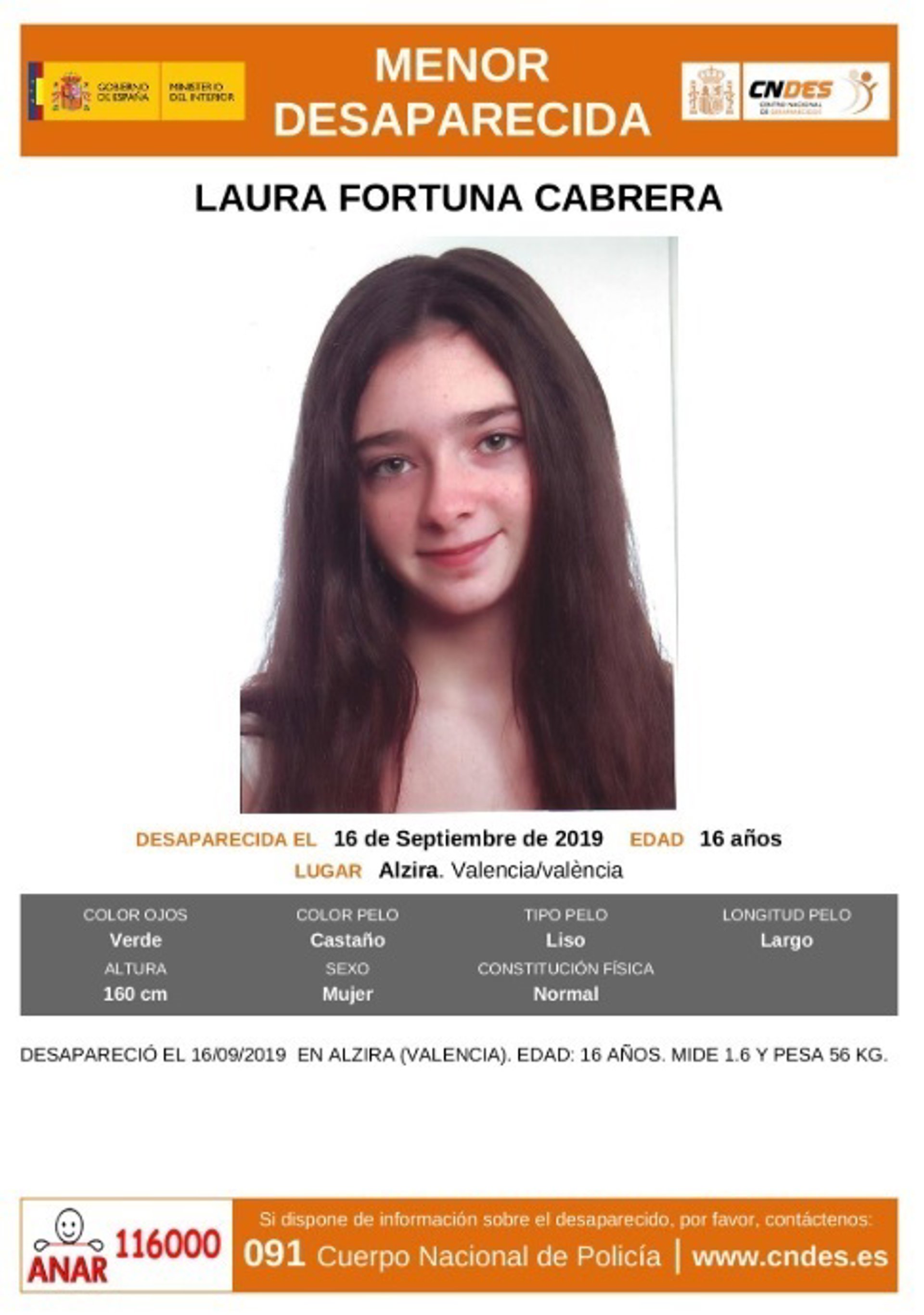 Las fuerzas de seguridad habían solicitado ayuda para localizar a la chica, identificada como Laura Fortuna Cabrera, que mide 1,60, tiene los ojos verdes, y el pelo castaño y liso, según la descripción facilitada.