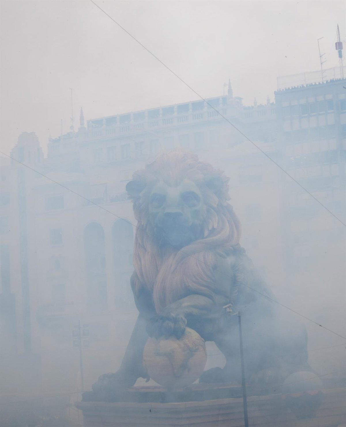La pirotecnia Caballer FX, de la población valenciana de Moncada, ha desafiado este miércoles a la lluvia y ha ofrecido en la Plaza del Ayuntamiento de Valencia una 'mascletà' intensa con un ritmo rápido y un terremoto final atronador que ha logrado el aplauso y la ovación de los miles de valencianos y turistas que se han congregado en este enclave para verla.