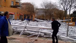 Por lo que respecta a la estructura de la falla Nou Campanar de Valencia, toda la estructura, que simula metal, aunque es de cartón, ha quedado derruida por el suelo sobre el mosaico que también formaba parte del monumento, según han confirmado a Europa Press fuentes municipales y de la Junta Central Fallera (JCF).