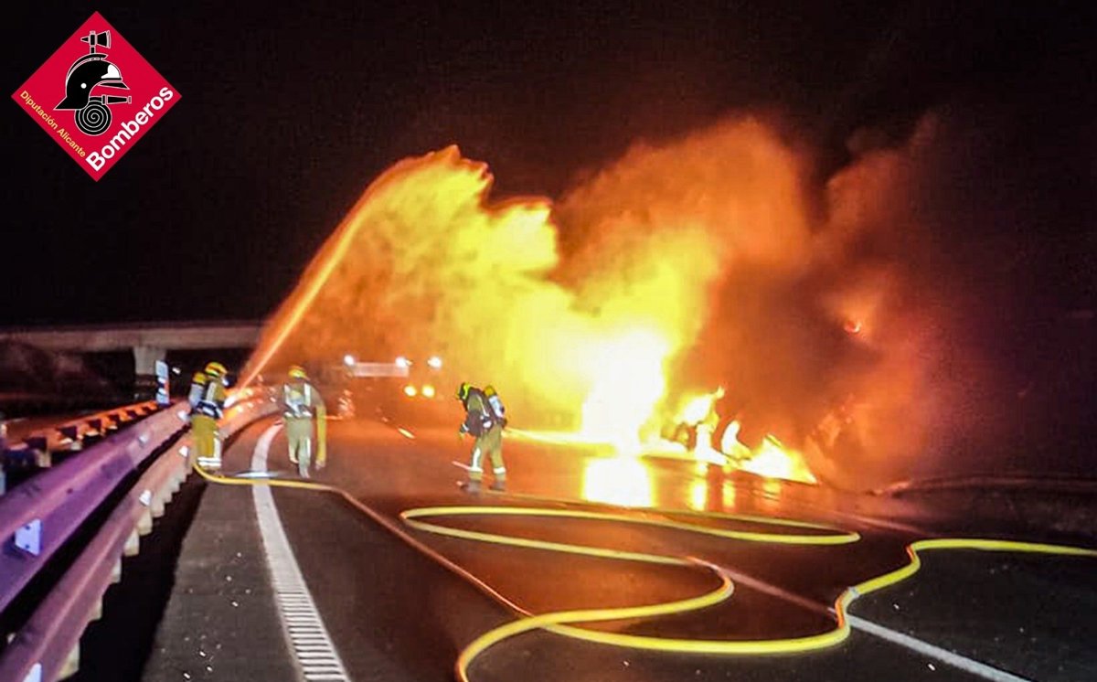Un incendio ha calcinado por completo un camión frigorífico de grandes dimensiones, que había quedado volcado en el arcén en la carretera A-31, a su paso por Novelda. Durante las labores de extinción, el carril derecho de la vía, en dirección Madrid, ha permanecido cortado al tráfico, según han informado a Europa Press el Consorcio Provincial de Bomberos de Alicante y la Guardia Civil de Tráfico.