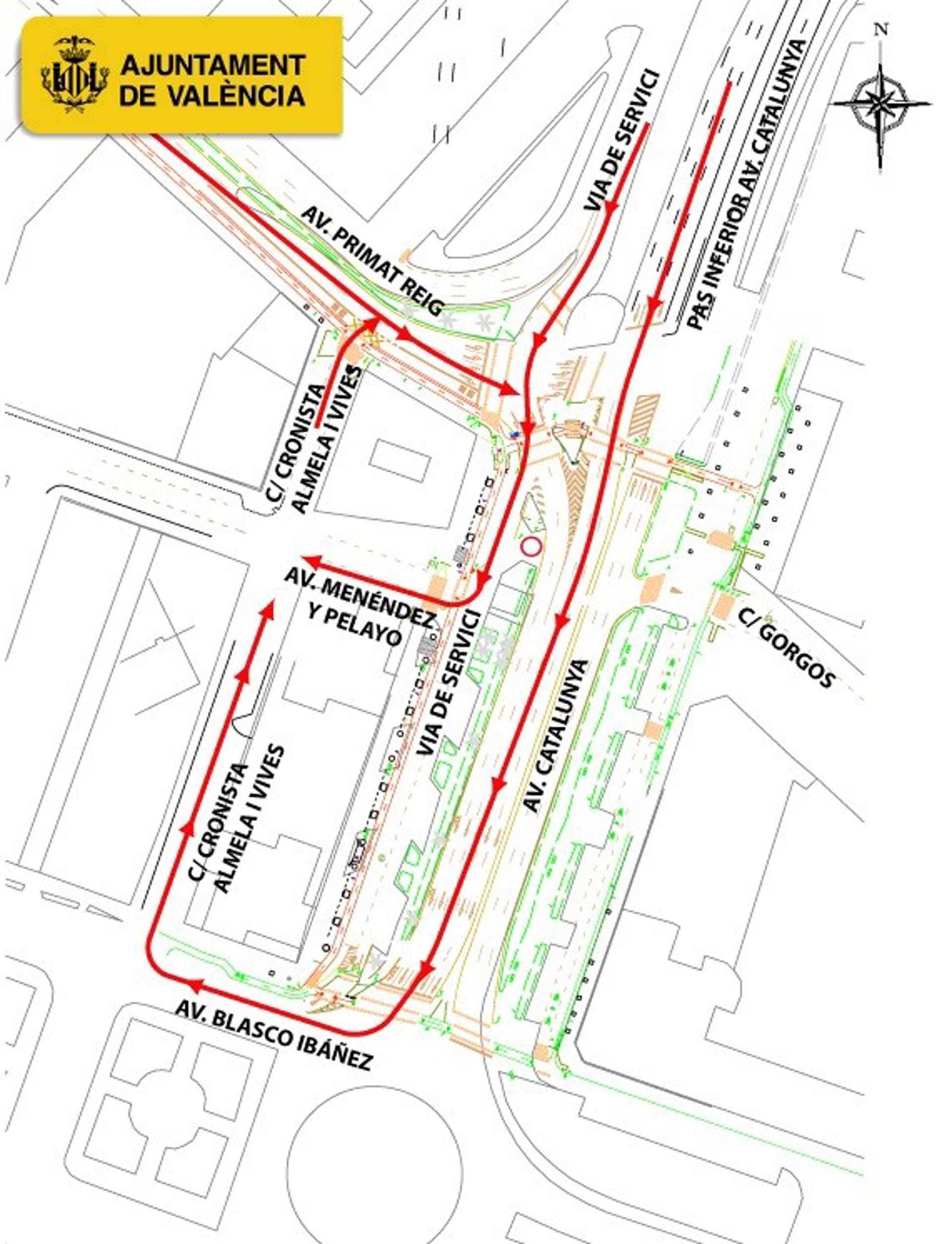 Otro de los cambios es que para acceder a la avenida Menéndez y Pelayo se deberá entrar desde la vía de servicio de la avenida Catalunya o desde Primado Reig, pero ya no puede hacerse este movimiento desde el paso inferior de la avenida Catalunya de entrada. Si se transita desde el paso inferior y se quiere llegar a Menéndez y Pelayo, la persona conductora deberá llegar hasta la avenida Blasco Ibáñez y acceder por la calle Cronista Almela i Vives.