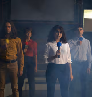 Poniendo en marcha las 10 estrategias de manipulación mediática de Noam Chomsky y Desinformación de Pascual Serrano, los intérpretes viajarán junto al público por este recorrido mediático.