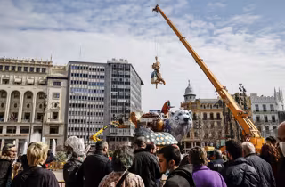Archivo - Varias personas observan como una grúa monta la falla del Ayuntamiento para la fiesta de las Fallas 2022 - Rober Solsona - Europa Press - Archivo