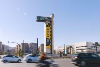 Valncia, como Capital Mundial del Diseño, desde este viernes da la bienvenida a todas las personas que entran a la ciudad por una de sus arterias principales, la carretera V-21, con una lona gigante colgada de la Torre Miramar.
