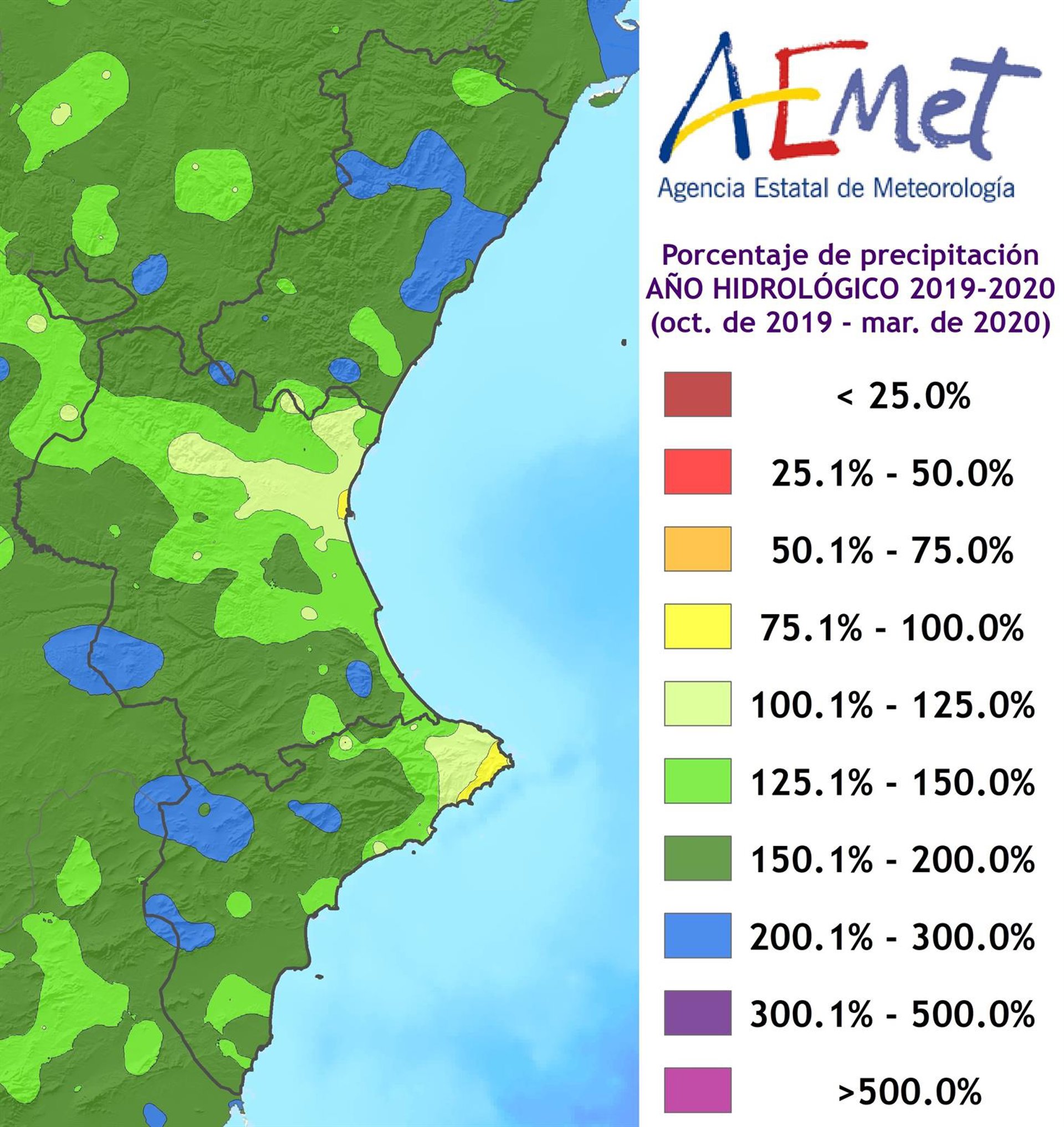 Casi toda la Comunitat Valenciana presenta superávit de precipitaciones a mitad del año hidrológico 2019-2020, lo que supone que en todo el territorio, excepto en la costa de la ciudad de Valncia y el litoral sur de la Marina Alta, ha llovido por encima del promedio normal.