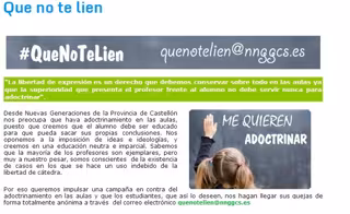 La titular de Educación ha realizado estas manifestaciones en un acto de homenaje al poeta Vicent Andrés Estellés a cuestiones de los medios de comunicación referidas a la iniciativa de NNGG del PP de Castellón 'Que no te líen', en la que se anima a los alumnos a hacer llegar quejas anónimas sobre supuestos casos de "adoctrinamiento" de profesores en las aulas.