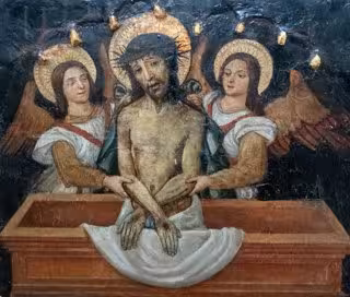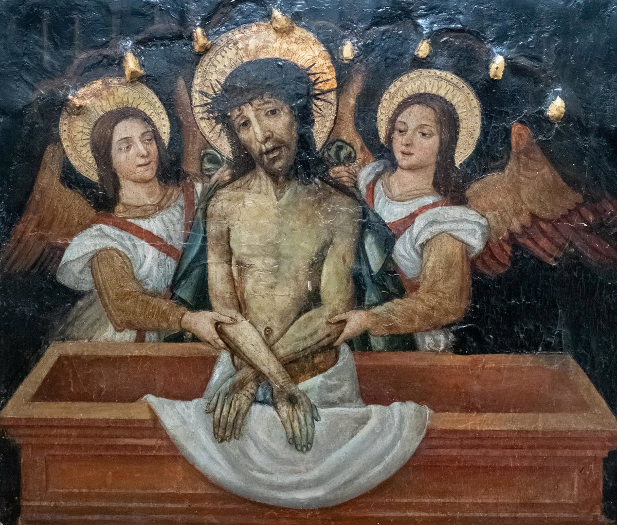 Esta tabla representa a "Cristo paciente" (Christus Patients), un tema bastante común a finales de la Edad Media y comienzos del Renacimiento. En la escena aparece la figura de Jesucristo, con las heridas de la Pasión, saliendo del sepulcro y sostenido por dos ángeles. Las otras dos escenas, aún desaparecidas, son la de Pentecostés y la de la Dormición de la Virgen.