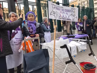 Alrededor de un centenar de mujeres han reivindicado este jueves, Día de la Mujer, a través de una performance con tendederos, delantales, escobas y otros utensilios el "trabajo invisible" que cada día protagonizan en el cuidado de la casa las personas mayores y los enfermos.