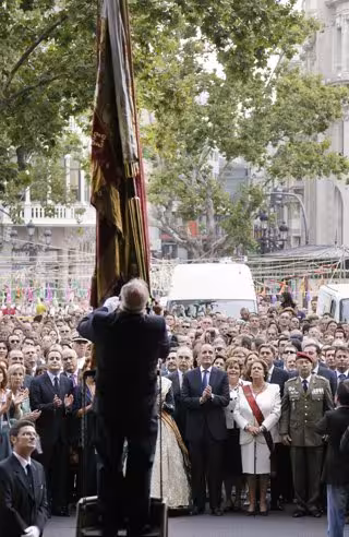 Tras el oficio religioso, la bandera ha continuado su recorrido protocolario saliendo de la seo por la Puerta de la plaza de La Almoina. Ha seguido por la calle Barchilla, la plaza de la Reina y la calle de la Paz, hasta llegar a la plaza de Alfonso el Magnánimo, donde se ha homenajeado al Rey Jaume I, con una ofrenda de coronas de laurel ante su estatua.
