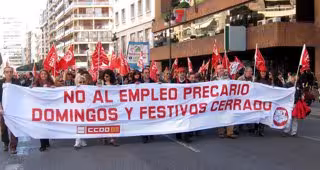 La manifestación la ha encabezado una gran pancarta en la que podía leerse 'No al empleo precario. Domingos y festivos cerrado' y, además, algunos trabajadores llevaban pequeños carteles con frases como 'La patronal nos roba' o 'Yo tampoco compro en domingo'.