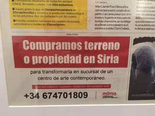 Asimismo, Nuria Güell (Vidreras, Gerona, 1981) y Levi Orta (La Habana, 1984) atraviesan los dispositivos de poder originando la crítica desde sus propias estructuras. La estética de un mapa inmobiliario es una acción-instalación que se inserta en la especulación de los mercados, que fluctúan camuflados en las buenas intenciones que estimulan los tópicos políticos de moda. Los artistas compran una propiedad en Siria, a una familia refugiada en Europa, aprovechando la situación de conflicto en su país de origen y su necesidad económica. Este proyecto se realiza en colaboración con el Middlesbrough Institute of Modern Art, institución a la cual los artistas donarán la propiedad adquirida. Un anuncio en prensa, prolongará la pieza fuera de las estructuras del Centro Cultural, interpelando al lector ante la posibilidad de compra.