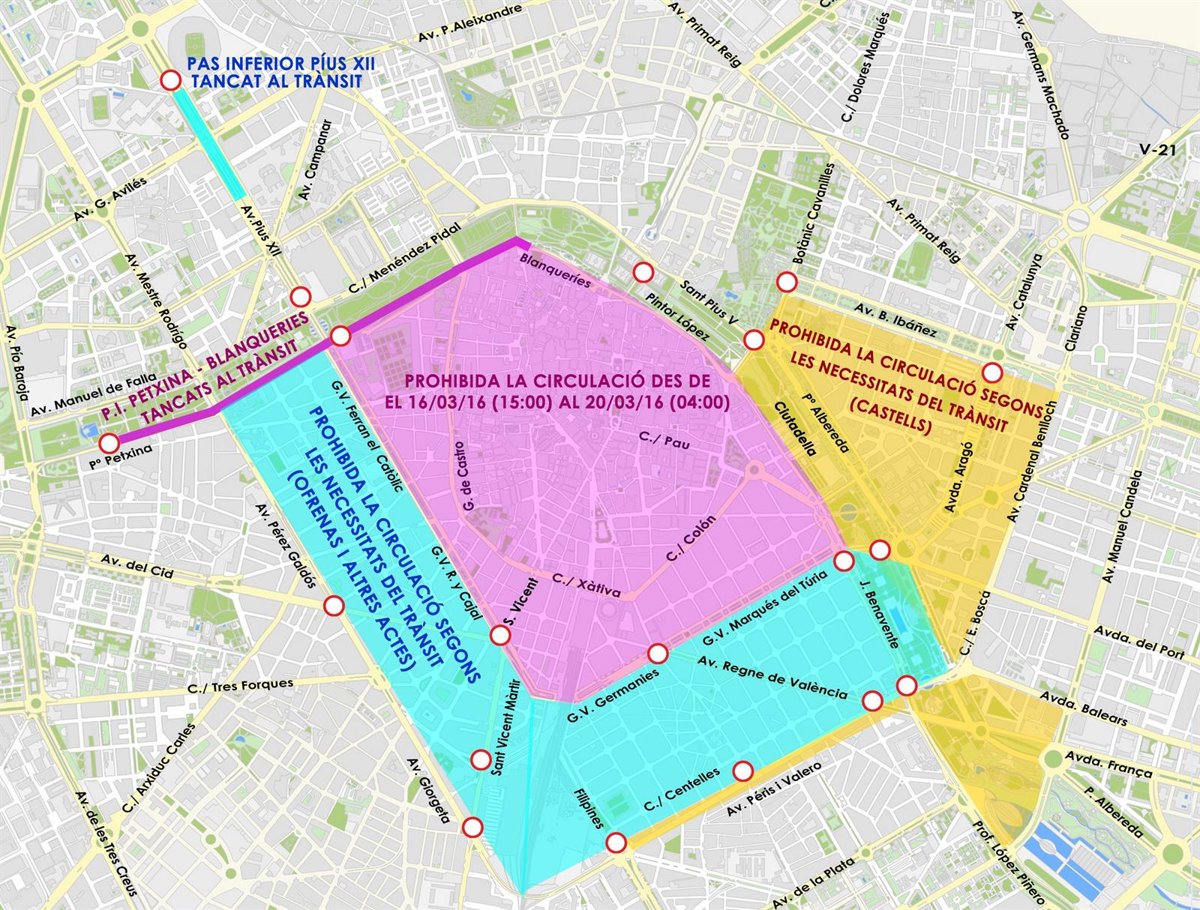 La circulación de vehículos particulares quedará prohibida en toda la zona interior del perímetro formado por la vía marginal derecha del cauce del río Turia --desde el puente de las Glorias Valencianas hasta la plaza de América-- y las Grandes Vías, incluyendo la Plaza de España y los pasos inferiores de la Pechina, con la excepción de los autobuses urbanos, taxis, vehículos de servicio público, vehículos oficiales autorizados por el Área de Movilidad y vehículos que atiendan emergencias.
