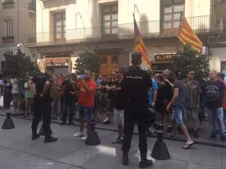 Cerca de un centenar de taxistas han recibido este miércoles al ministro de Fomento, José Luis Ábalos, en las puertas del Palau de la Generalitat al grito de "corrupto" y "queremos que se cumpla la ley, queremos trabajar".