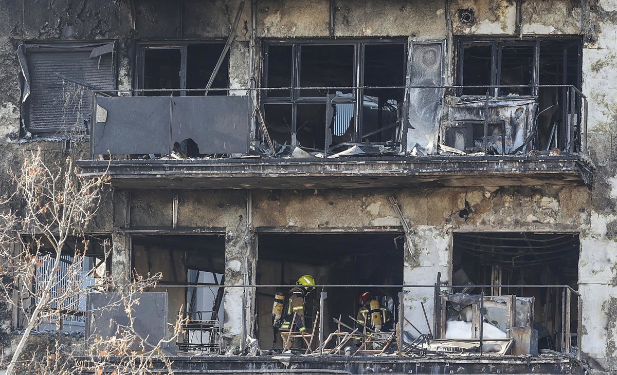 Dos agentes de la Policía Científica buscan las causas del incendio en el edificio del barrio de Campanar - Rober Solsona - Europa Press