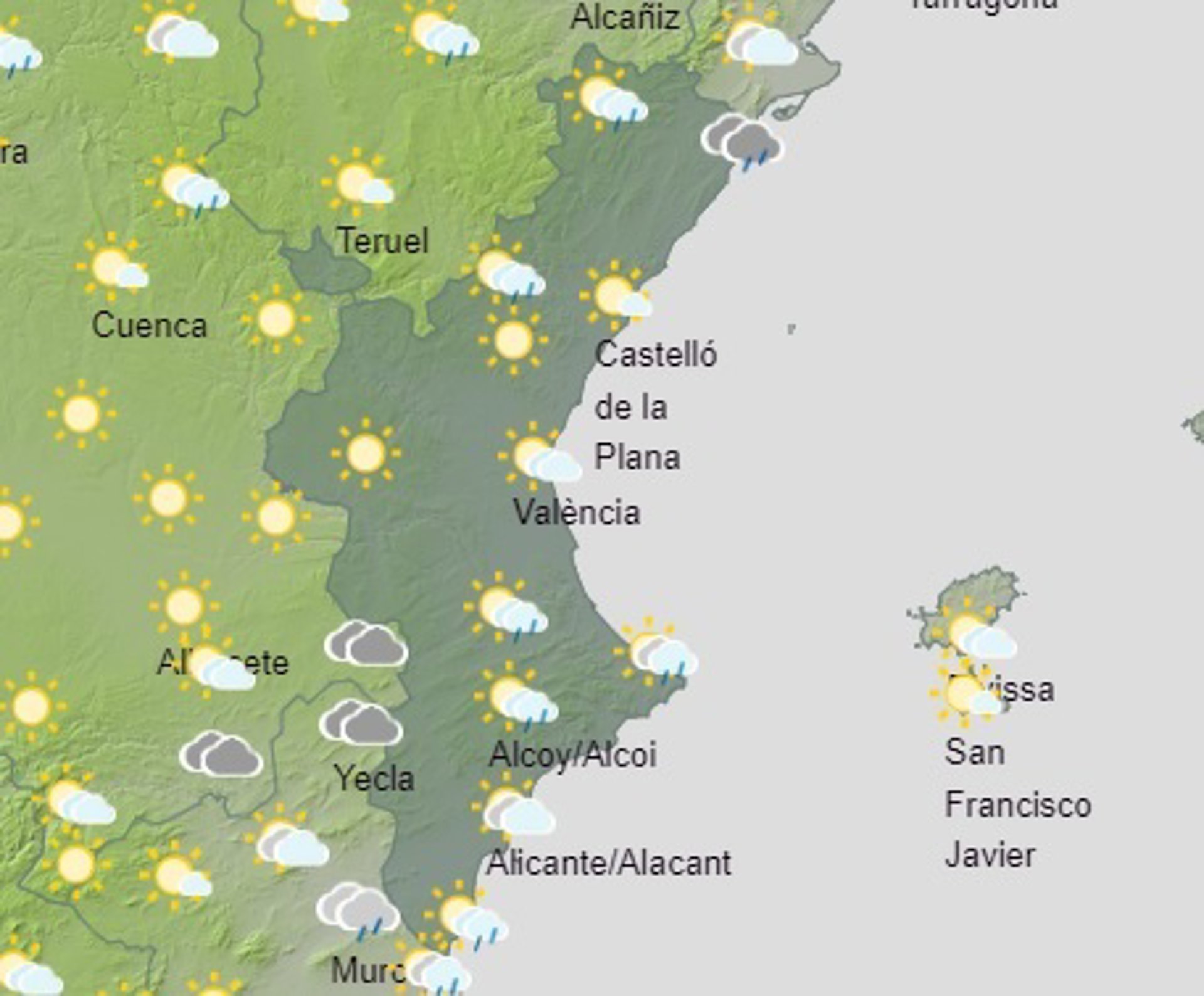 Finalmente, en Alicante, se esperan máximas de 26 en Orihuela y Elche, 25 en Dénia y Alicante, y 22 en Alcoi. Las mínimas serán de 12 en Alcoi, 15 en Elche, 16 en Orihuela y Dénia, y 17 en Alicante.