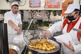 Archivo - Dos trabajadores hacen churros y buñuelos en las Fallas 2022 - Rober Solsona - Europa Press - Archivo