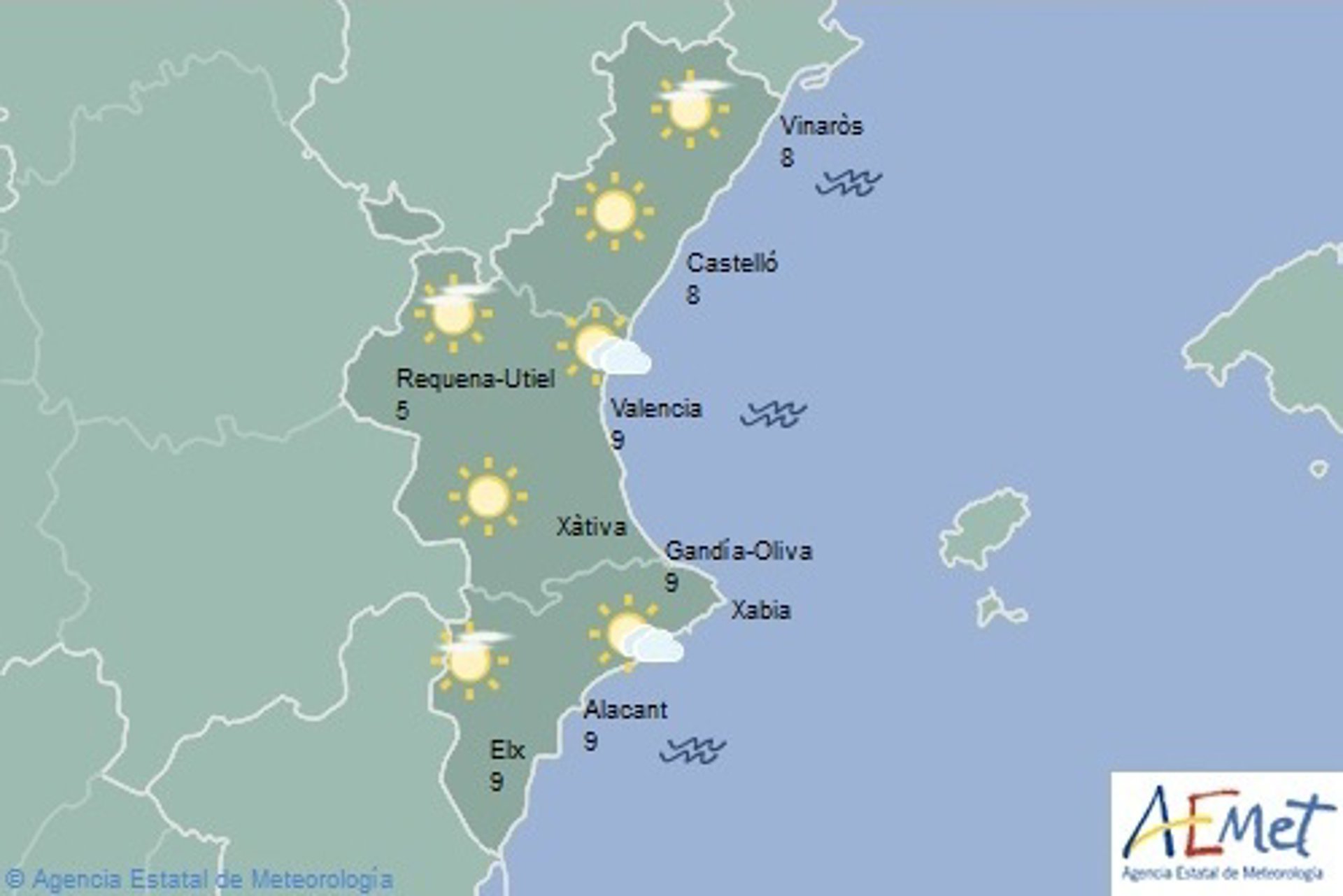 Las temperaturas se mantendrán con pocos cambios. Así, las máximas podrían alcanzar los 19 grados en Ontinyent y Alcoi, los 18 en Alicante, los 17 en Valencia y los 16 en Castellón.