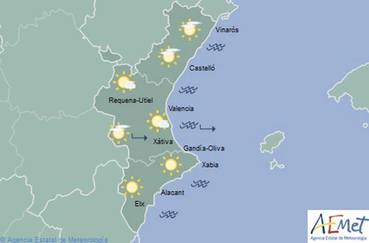 Por su parte, el viento soplará esta jornada variable flojo con predominio de la componente oeste en la Comunitat Valenciana, según las mismas fuentes.