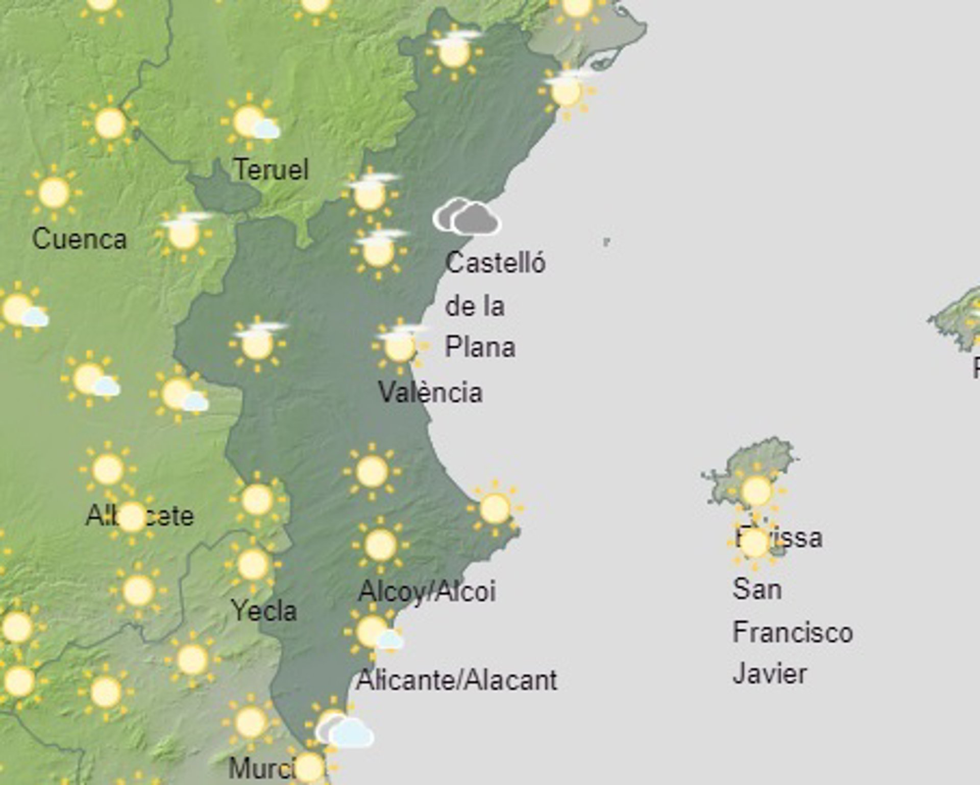 Finalmente, en la provincia de Alicante, las máximas serán de 26 en Orihuela, 25 en Alcoi, 23 en Elche y 21 en Dénia y Alicante, mientras que las mínimas rondarán los 10 en todas las localidades.