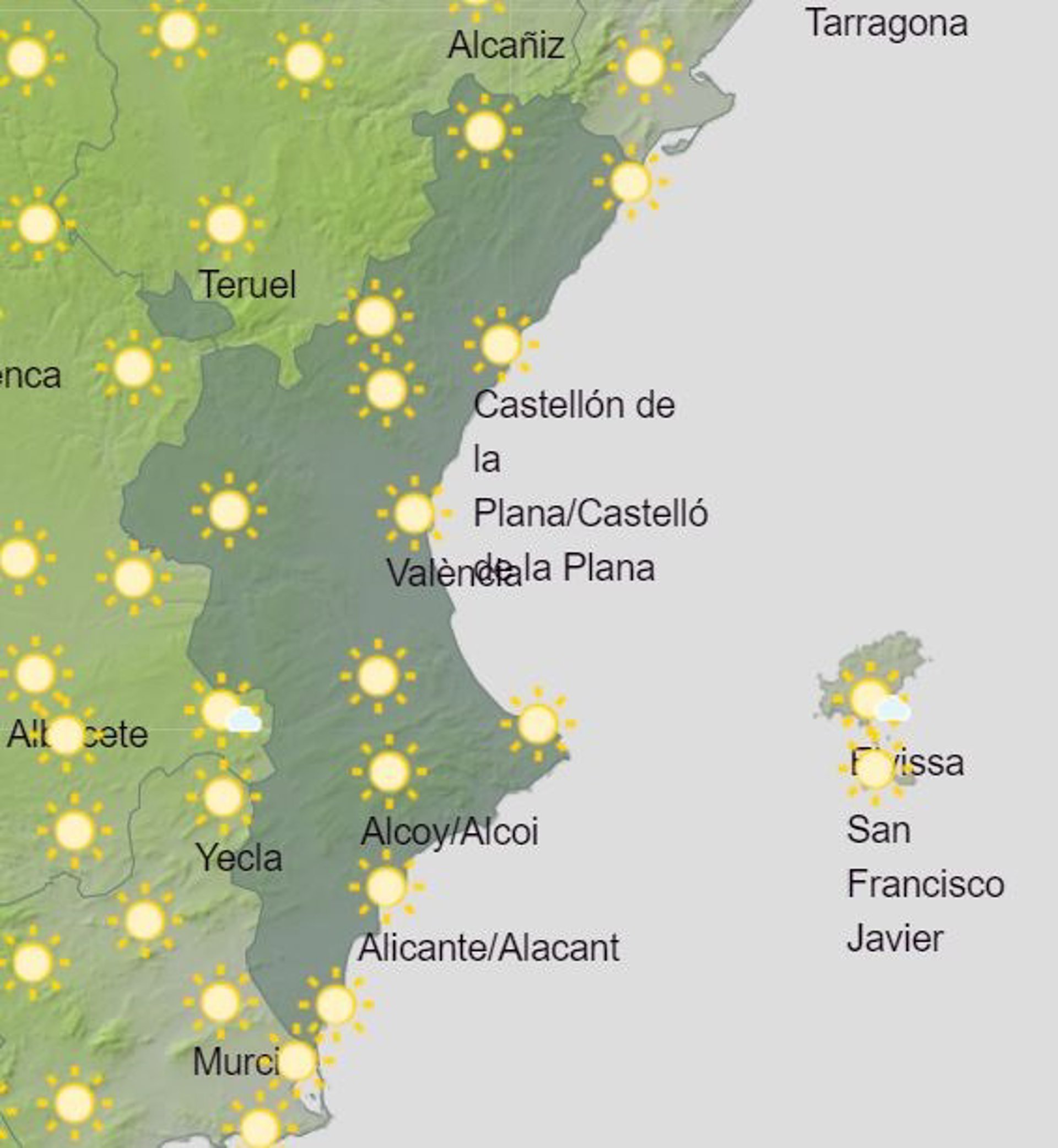 La Comunitat Valenciana arranca el fin de semana con cielos despejados o poco nubosos, y en el litoral sur se producirán intervalos de nubes bajas, según la predicción de la Agencia Estatal de Meteorología (Aemet).