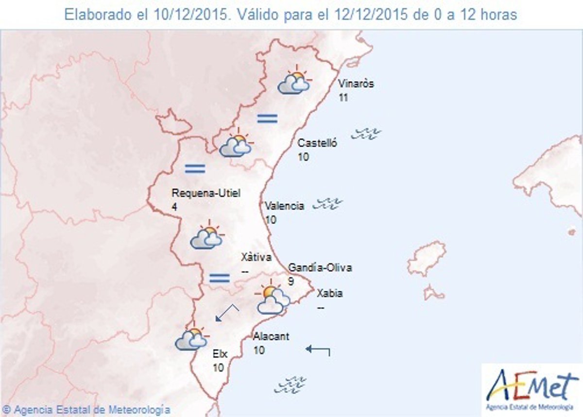 Además, podrían darse brumas matinales y las temperaturas experimentarán escasas variaciones. Así, los termómetros podrían alcanzar los 18 grados en Alicante y los 16 en Valencia y Castellón.