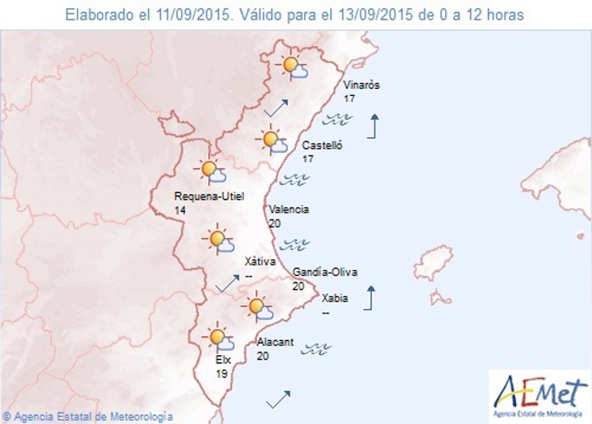 La Comunitat Valenciana tendrá este domingo cielos poco nubosos, con algunos intervalos de nubes medias y altas, y las temperaturas máximas irán en ascenso, según la predicción de la Agencia Estatal de Meteorología (Aemet).