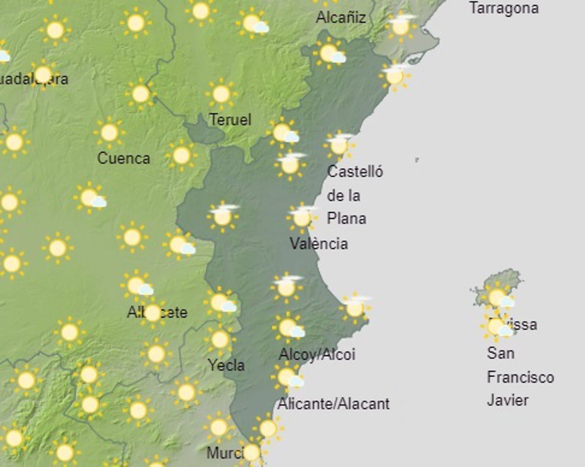 Finalmente, en Alicante, se esperan máximas de 20 en Alicante y Orihuela, 19 en Dénia y Elche, y 18 en Alcoi. Las mínimas serán de 6 en Alcoi, 7 en Elche y Orihuela, 10 en Alicante, y 11 en Dénia.