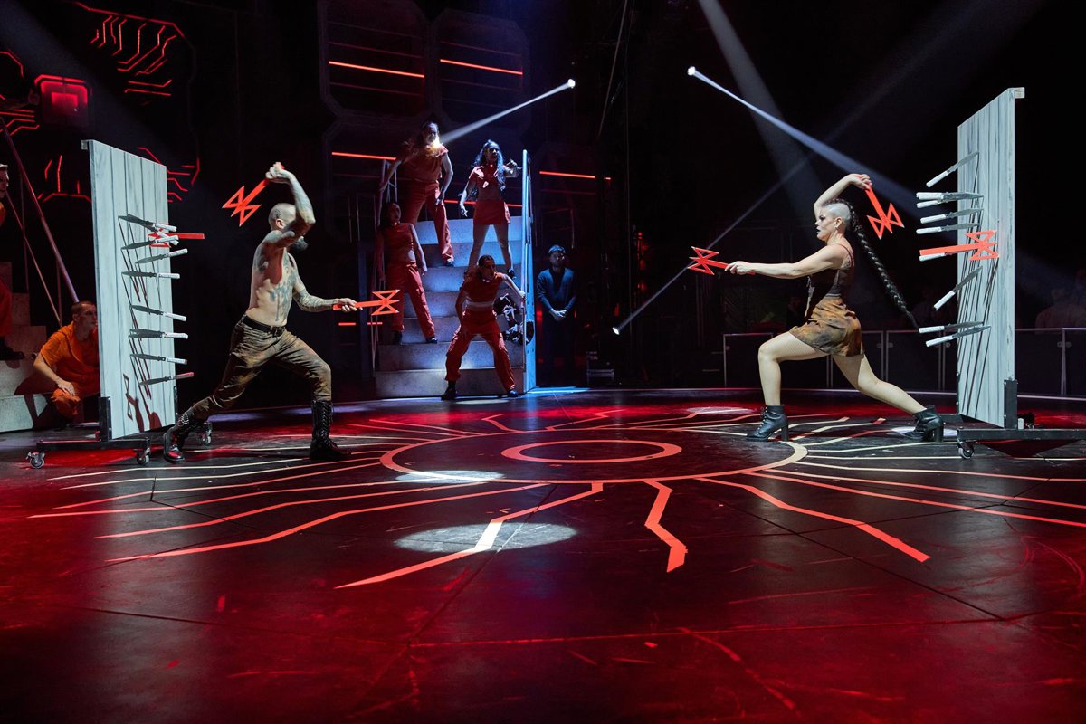 Los cuchillos surcan el aire cuando los bandos liderados por Michael Laner y Yary Celis (Italia/Colombia) se enfrentan en las gradas en un duelo dialéctico y coreográfico entre sexos. En otro lugar, las cinco contorsionistas de Ethiopian Girls (Etiopía) despertarán de su letargo en un experimento criogénico ideado por la IA, desplegando una plasticidad sobrehumana.