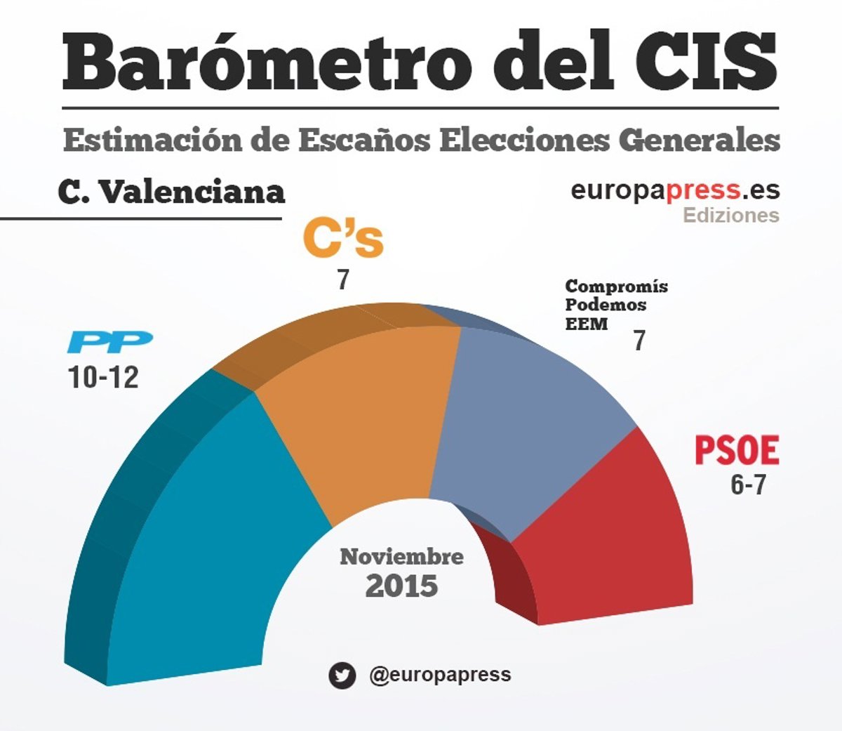 La macroencuesta del Centro de Investigaciones Sociológicas (CIS) para las elecciones generales otorga la victoria al PP en la Comunitat Valenciana con una horquilla de 10-12 escaños, mientras que Compromís-Podemos, PSOE y Ciudadanos podrían empatar a siete. Por su parte, EU-UP aspira a tener un escaño.