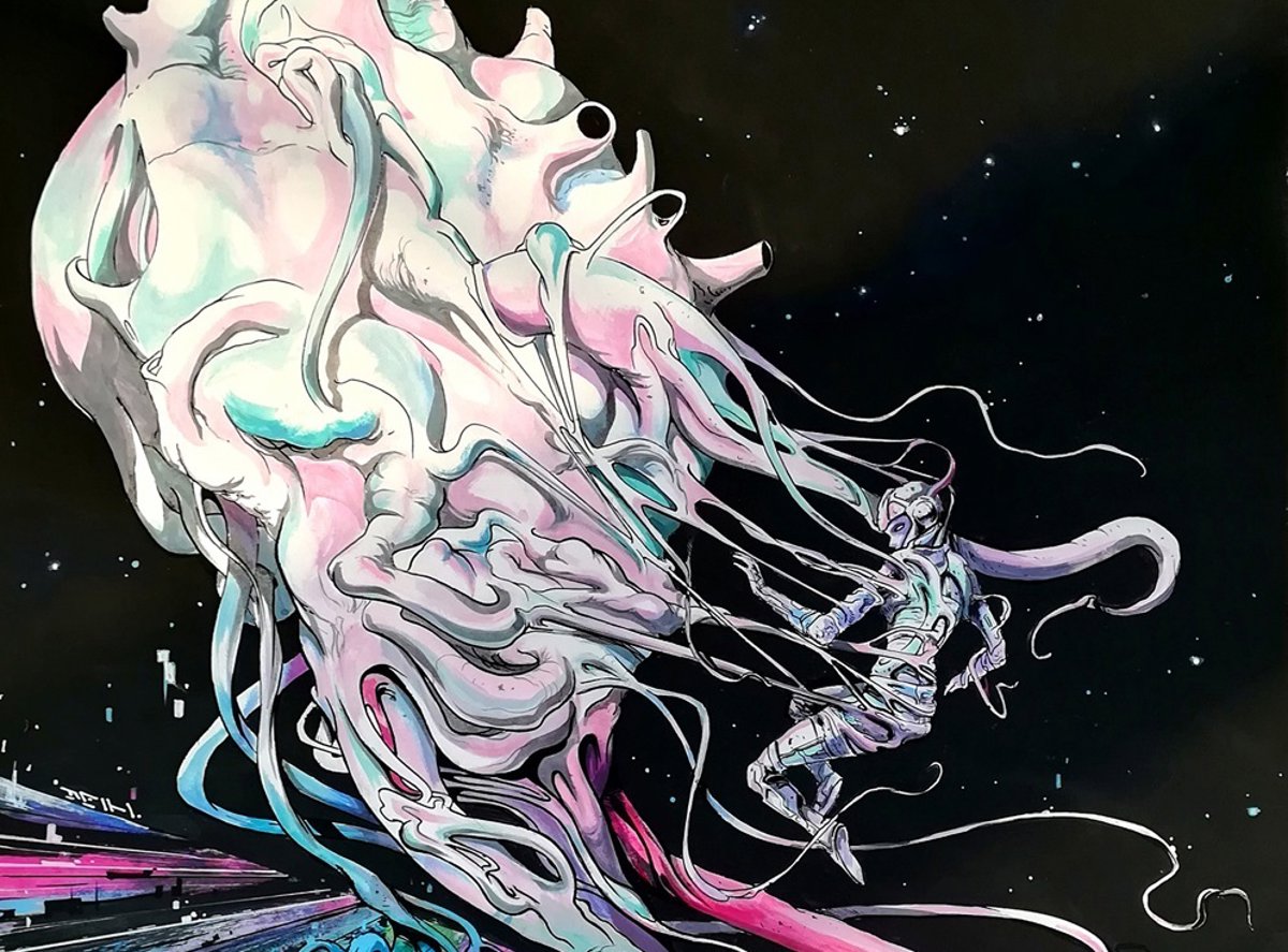Deih (Valncia, 1977) con un trabajo que habitualmente apunta hacia la representación icónica de un Insider en un paraje interestelar,
