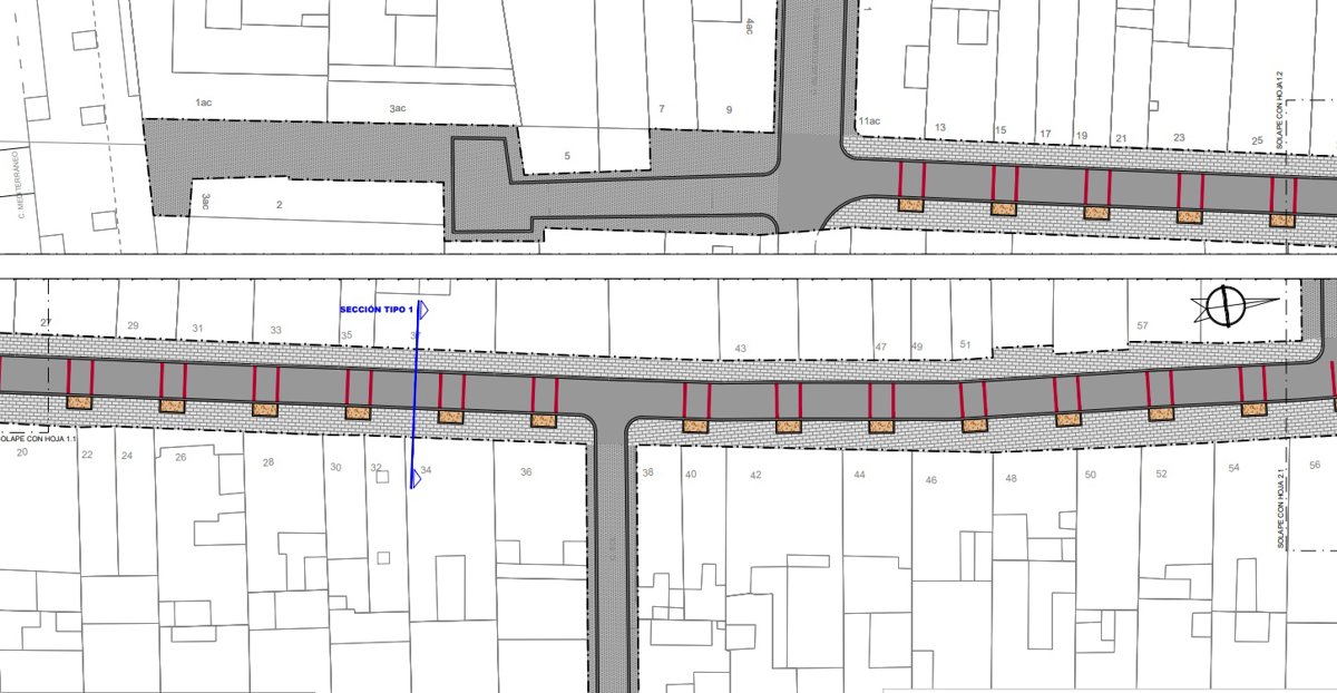 Ambas serán pavimentadas con adoquín de hormigón de acabado granítico. Además, se reasfaltará la calzada, añadiendo rigolas a ambos lados para separarla de las aceras, que será de tres metros de ancho. Todo ello en plataforma única.