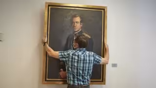 Un operario retira del retrato del rey emérito Juan Carlos I de la Sala de Gobierno del Legislativo foral del Parlamento de Navarra horas después de que la Junta de Portavoces aprobase el acto con los votos del Partido Socialista de Navarra, Geroa Bai, - Eduardo Sanz - Europa Press - Archivo