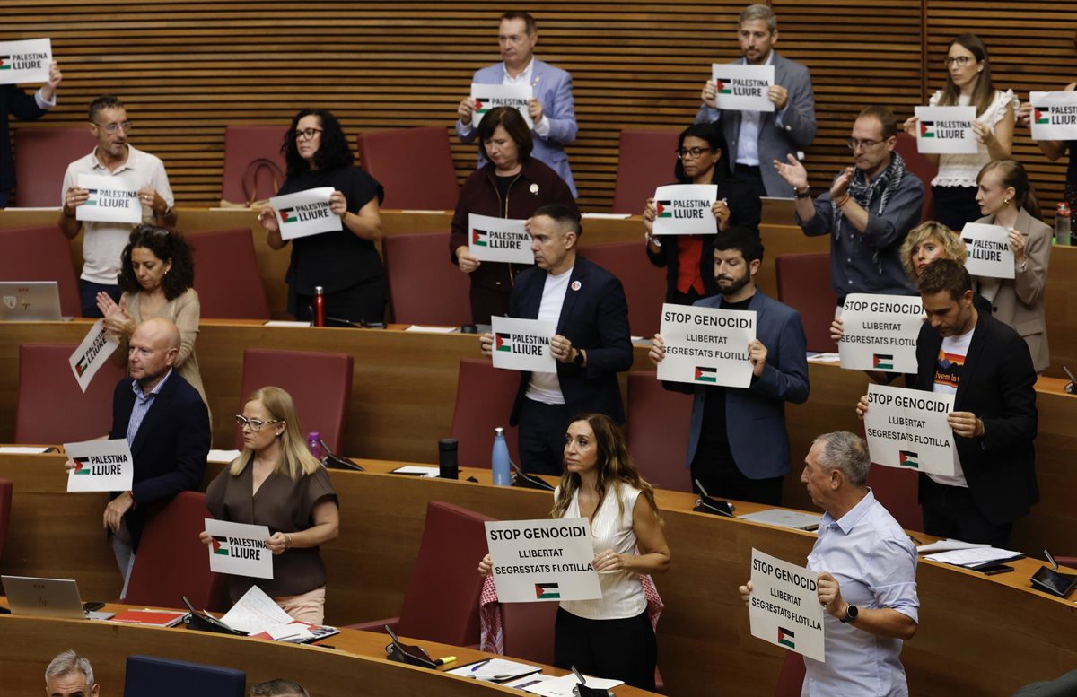 Seguidamente, los diputados de Compromís se han levantado con carteles con la bandera palestina y palabras de "stop genocidio" y a favor de la libertad para los interceptados por la flotilla.